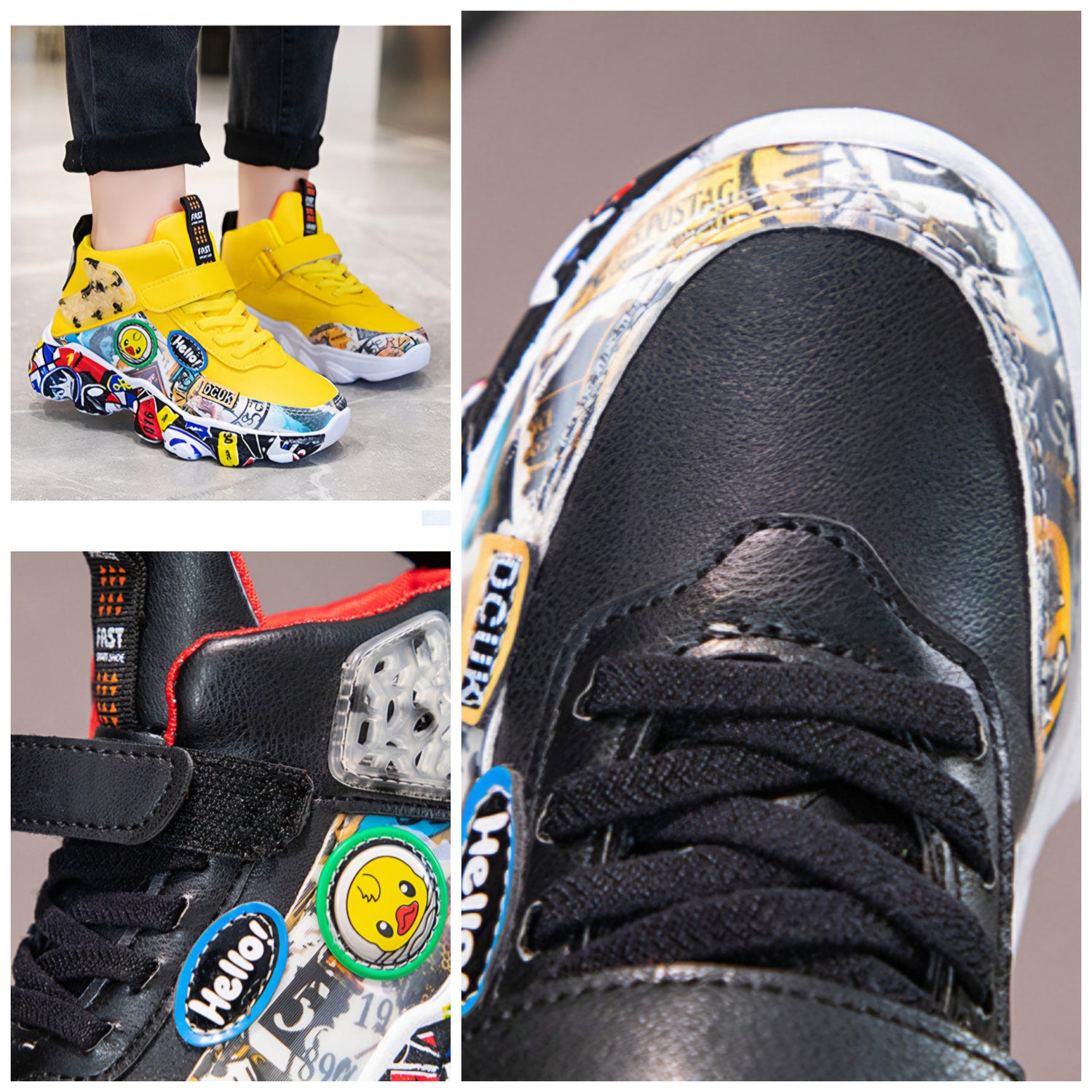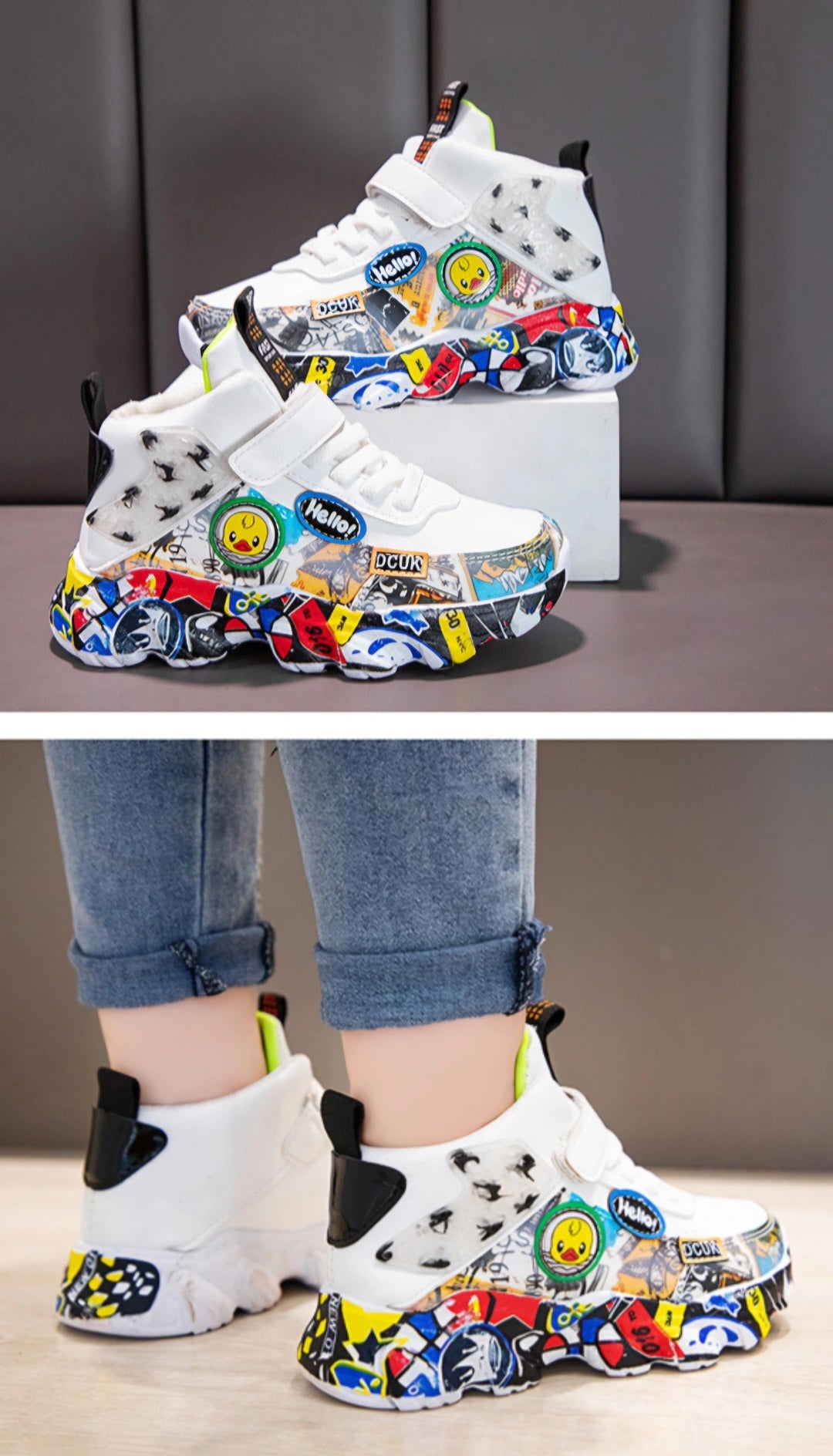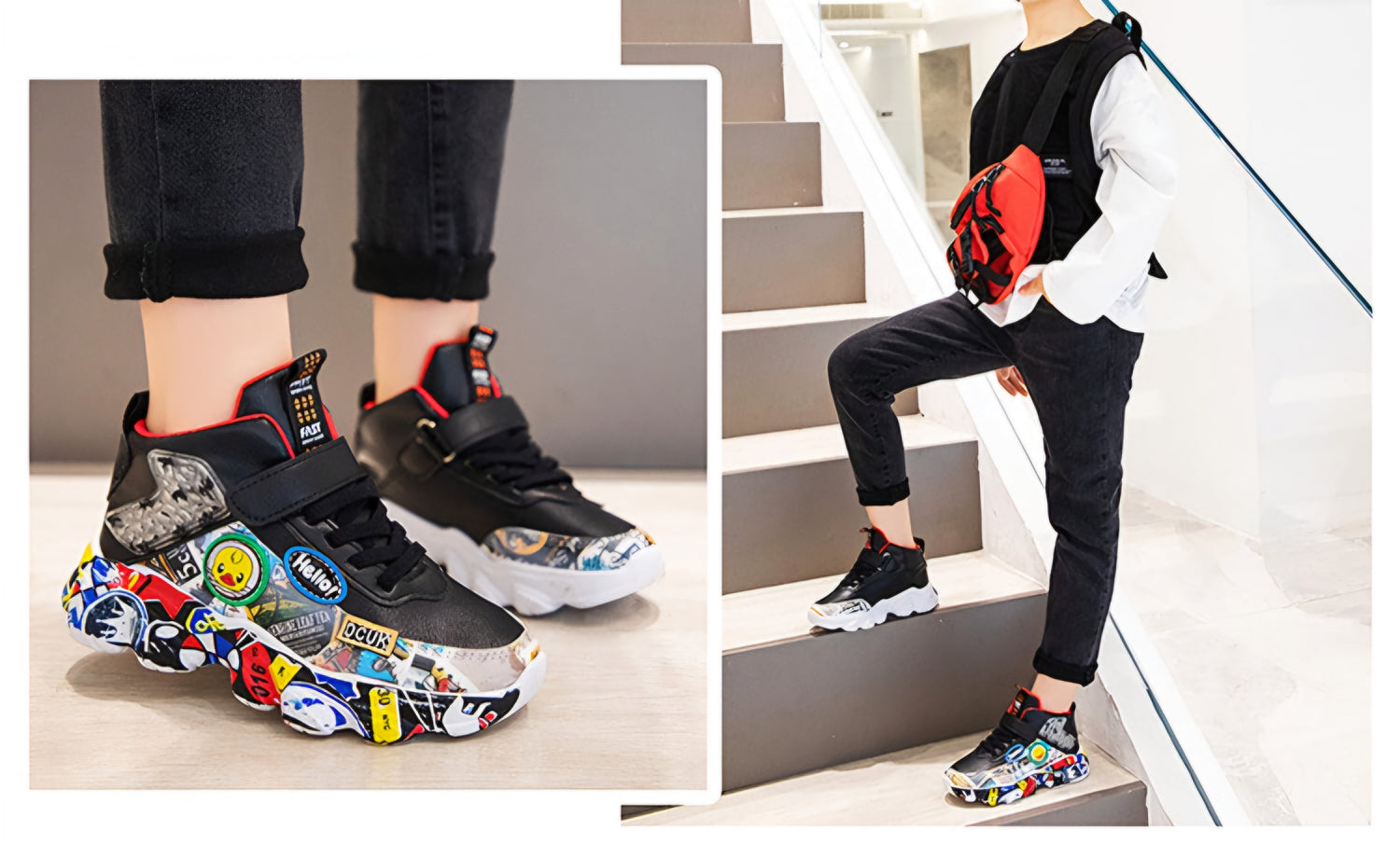 Il design vivace con dettagli grafici e patch multicolore rende queste scarpe perfette per bambini pieni di creatività e voglia di distinguersi.
